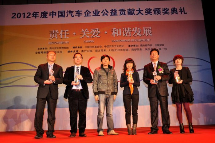 “2012年度中国汽车企业公益贡献大奖”以”责任•关爱•和谐发展”为主题,立足认真履行社会责任、持续关注和支持社会公益事业、真情回报社会、努力实现企业与社会和谐统一的中国汽车企业。